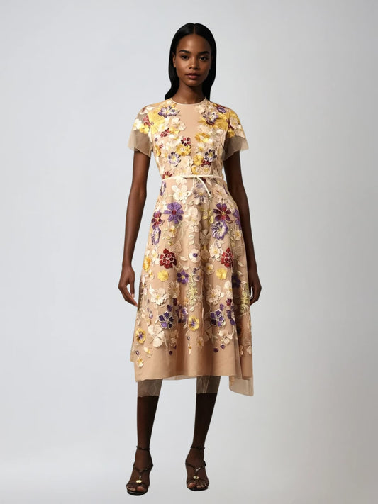 Geyra Short Sleeve Flower Embroidered Midi Dress