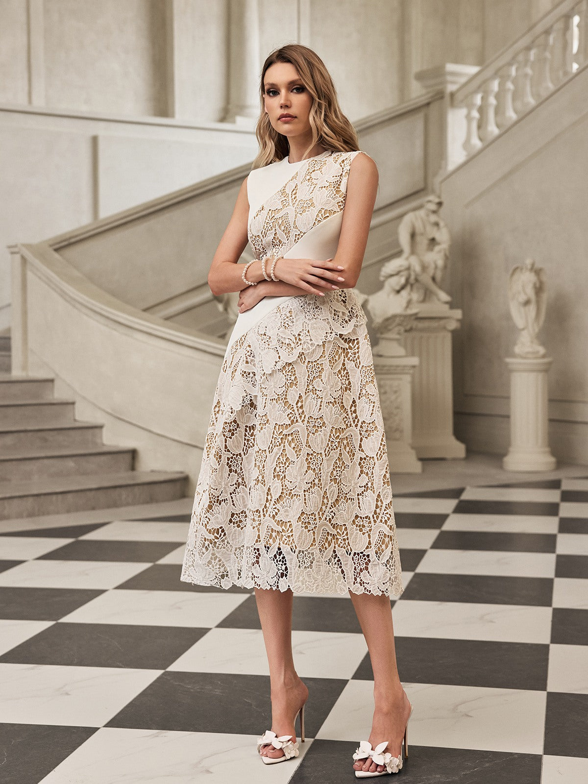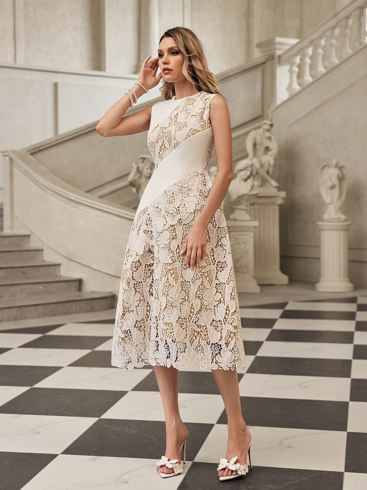The Fyrithia Sleeveless Lace Midi Dress combines delicate lace detailing with a flattering midi length for a timeless and elegant look. Its sleeveless design enhances comfort and ease of movement, making it ideal for special occasions or stylish everyday wear. Experience the perfect balance of sophistication and comfort with this charming dress that highlights your graceful silhouette effortlessly.