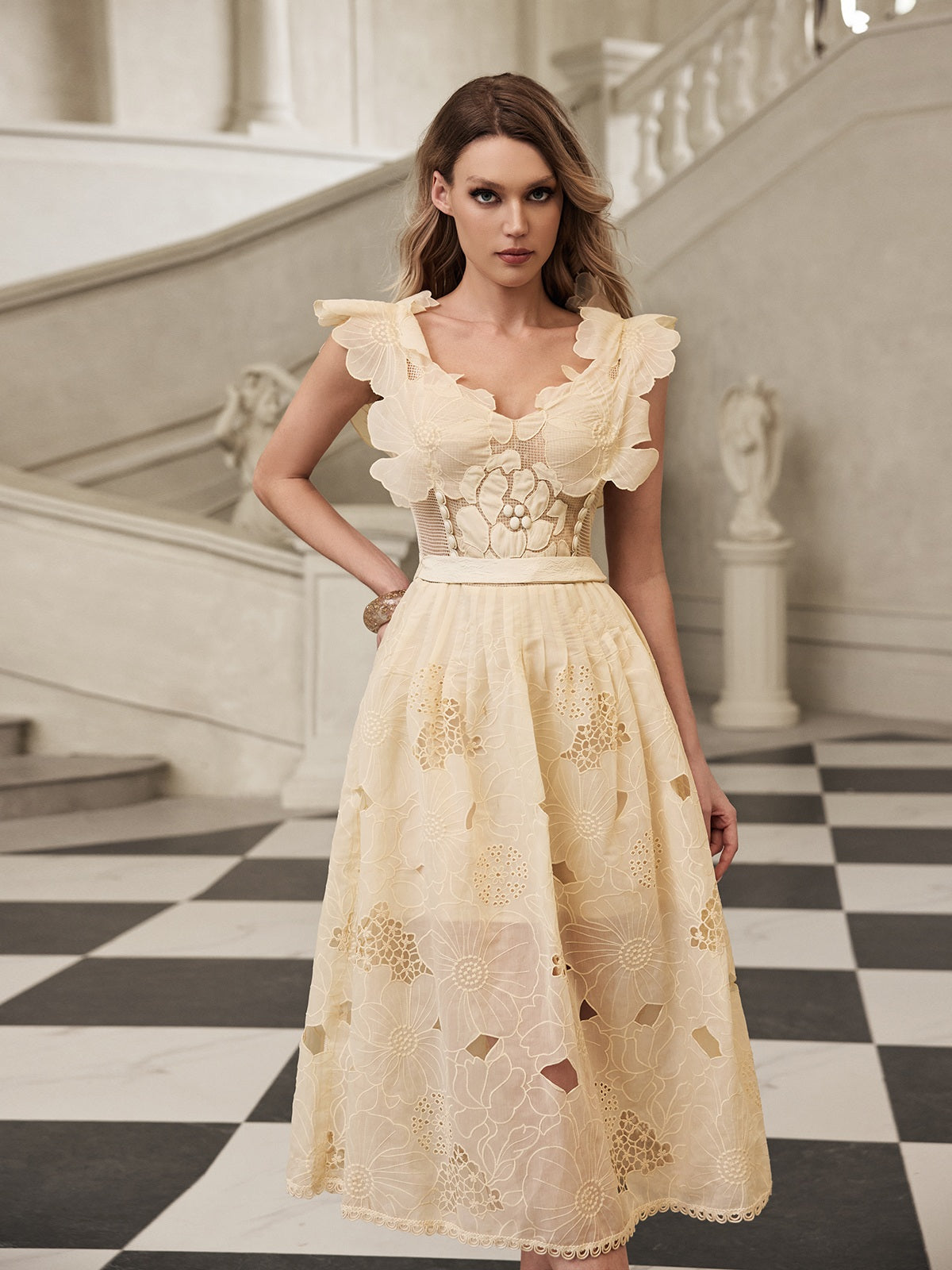 The Gryon Sleeveless Floral Cutout Midi Dress offers a perfect blend of charm and sophistication. Its sleeveless design and floral pattern create a fresh, feminine look, while the subtle cutout details add a modern edge. Crafted to flatter your silhouette, this midi dress is ideal for garden parties, brunches, or summer events where you want to stand out with grace and style.