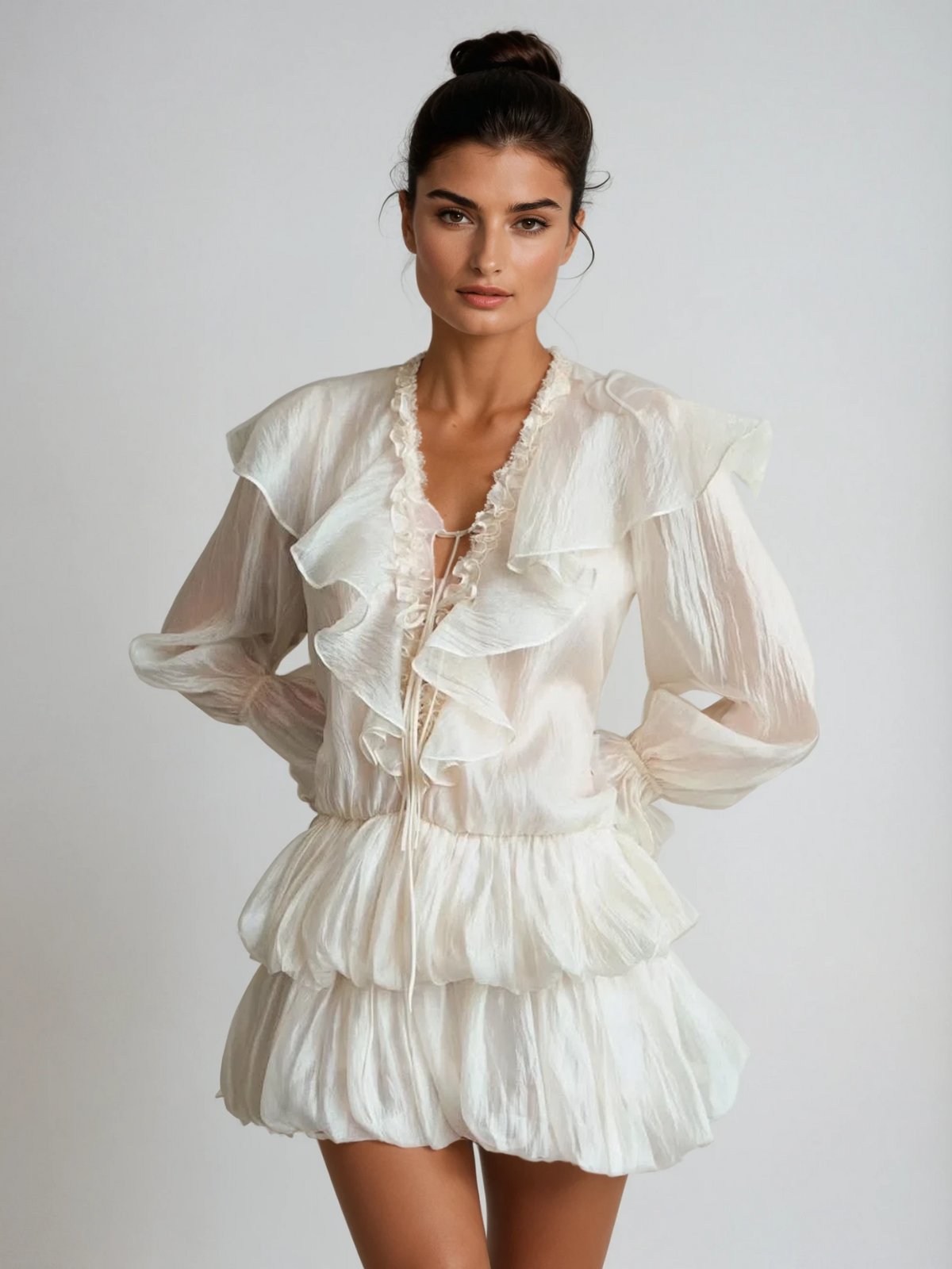 Embrace feminine elegance with the Kairu Flare Sleeve Ruffle Mini Dress. Featuring playful flare sleeves and delicate ruffle details, this dress adds a touch of romance to your look. Its flattering mini length makes it perfect for both daytime outings and evening events. Step out with confidence and style in this effortlessly charming piece.