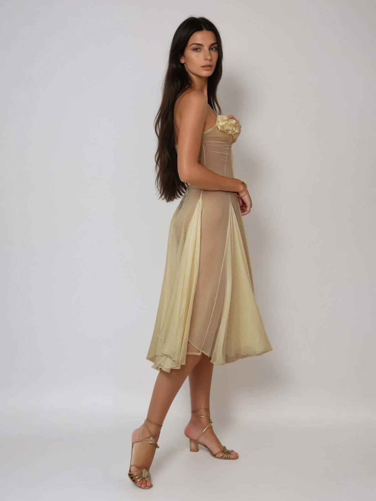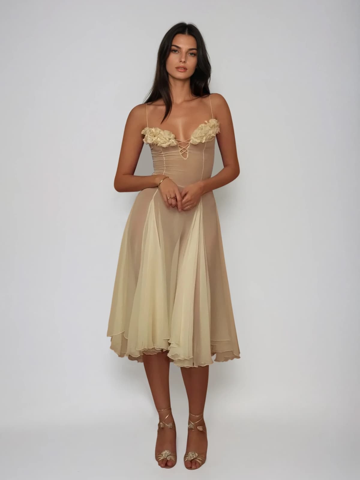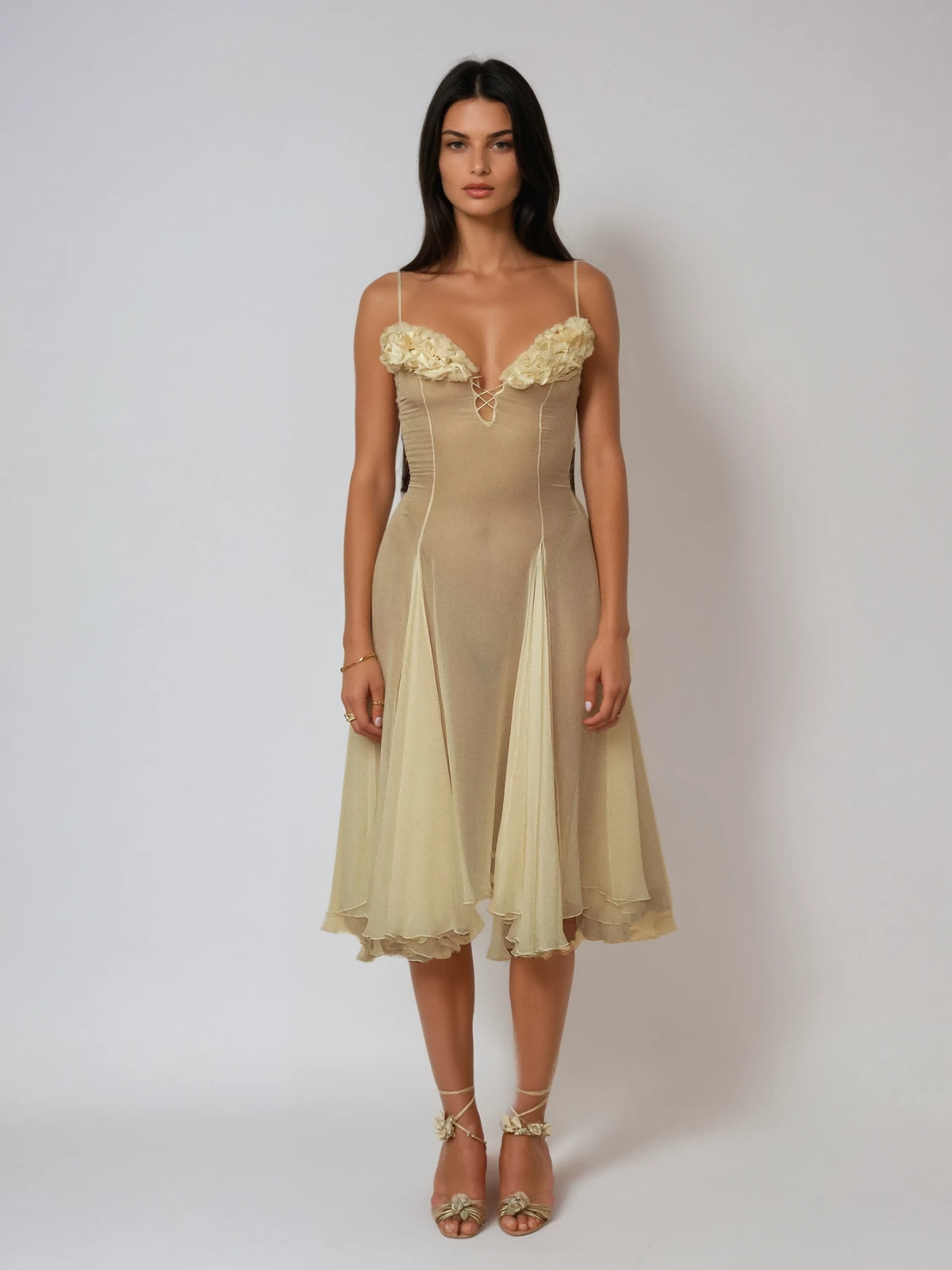 Drape yourself in elegance with the Kaveri Spaghetti Ruched Mesh Split Midi Dress. Its delicate spaghetti straps and ruched detailing create a flattering silhouette, while the mesh fabric offers a subtle allure. The daring side split adds a touch of sophistication and movement, making this midi dress perfect for occasions when you want to captivate with confidence and style.