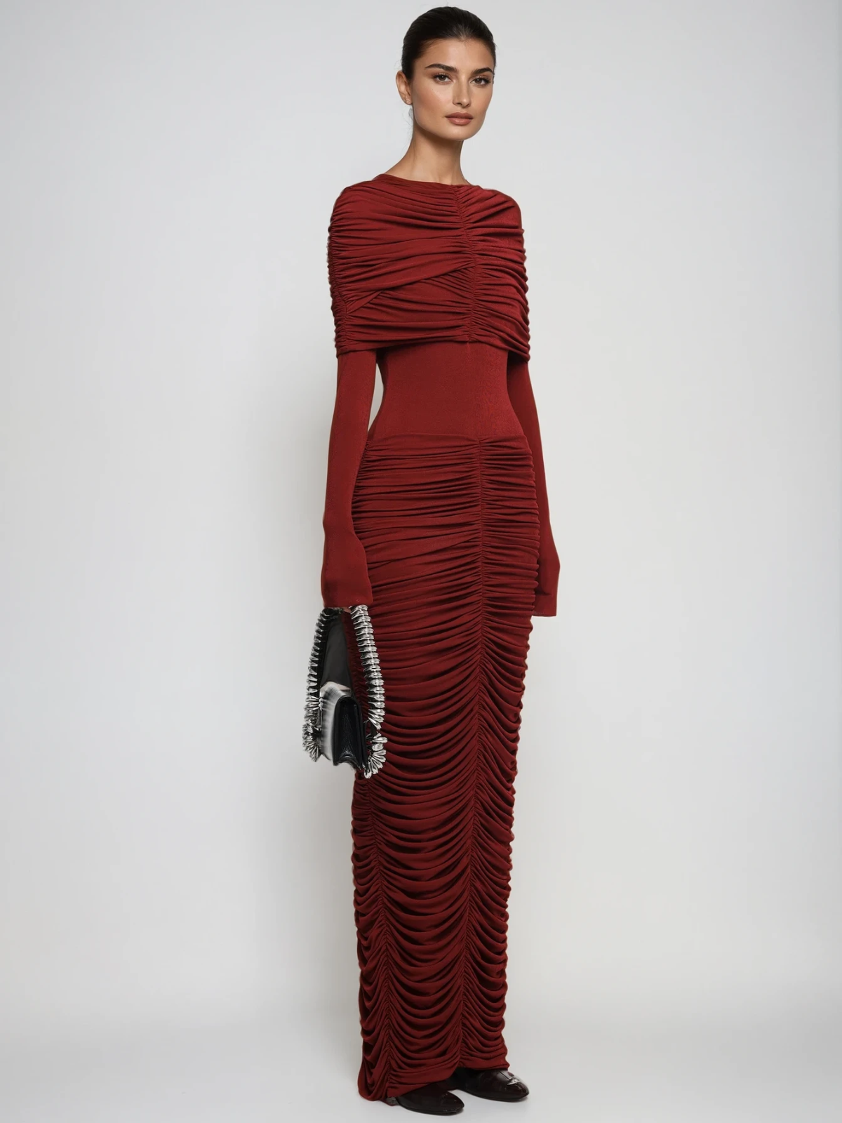 Elevate your elegance with the Liseli Long Sleeve Ruched Maxi Dress. Designed with flattering ruched detailing and sleek long sleeves, this dress accentuates your silhouette while providing graceful movement. Perfect for evening events or sophisticated occasions, its timeless style ensures you exude confidence and charm wherever you go. Make a lasting impression with this refined statement piece.