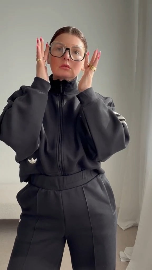 This set redefines casual elegance. The wide-leg trousers elongate the silhouette, while the relaxed high-neck zip jacket adds an effortlessly refined vibe. Subtle stripe accents at the sleeve and hem offer a nod to iconic sport style — reimagined for today.