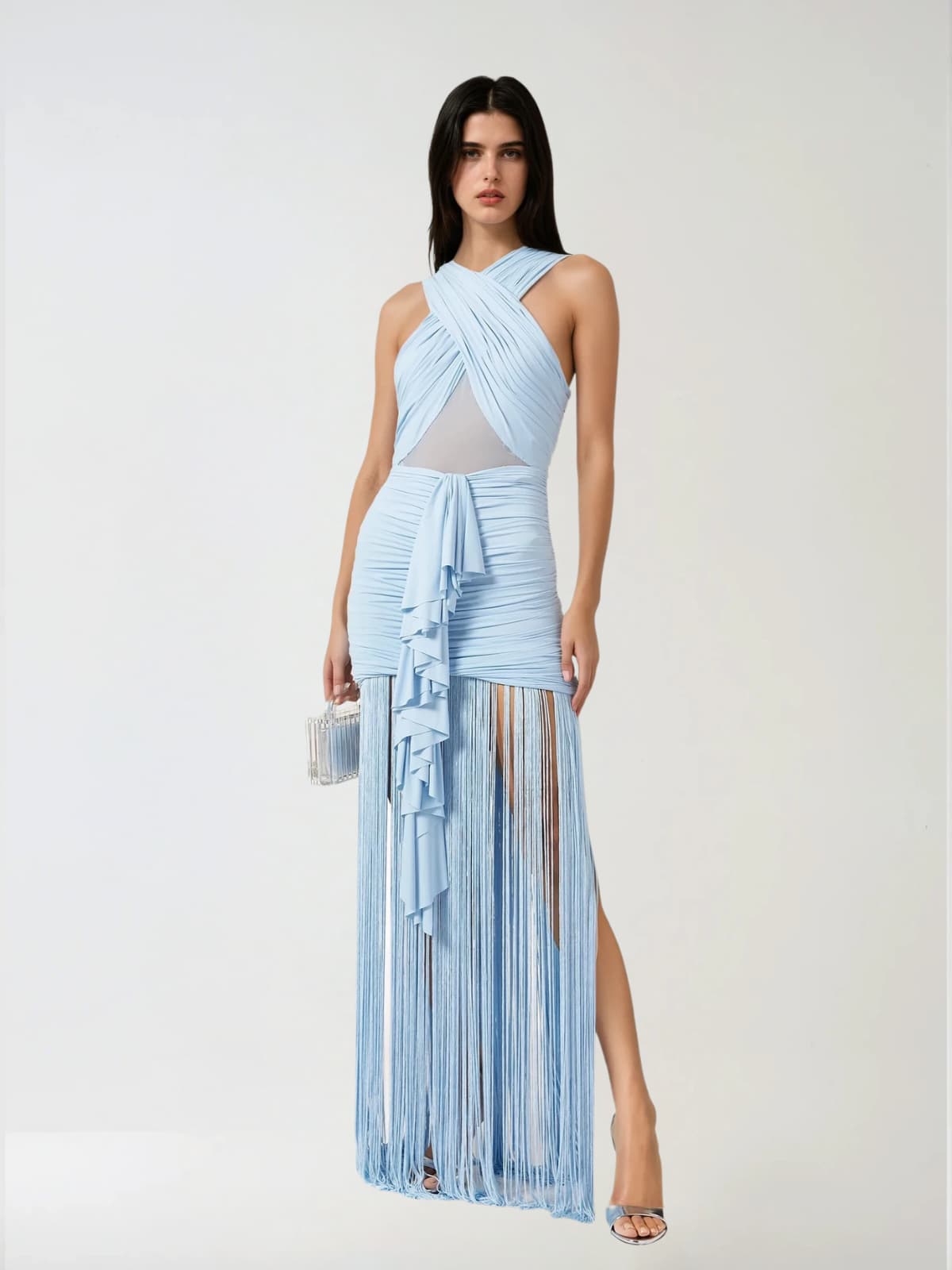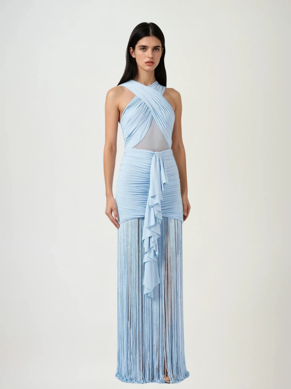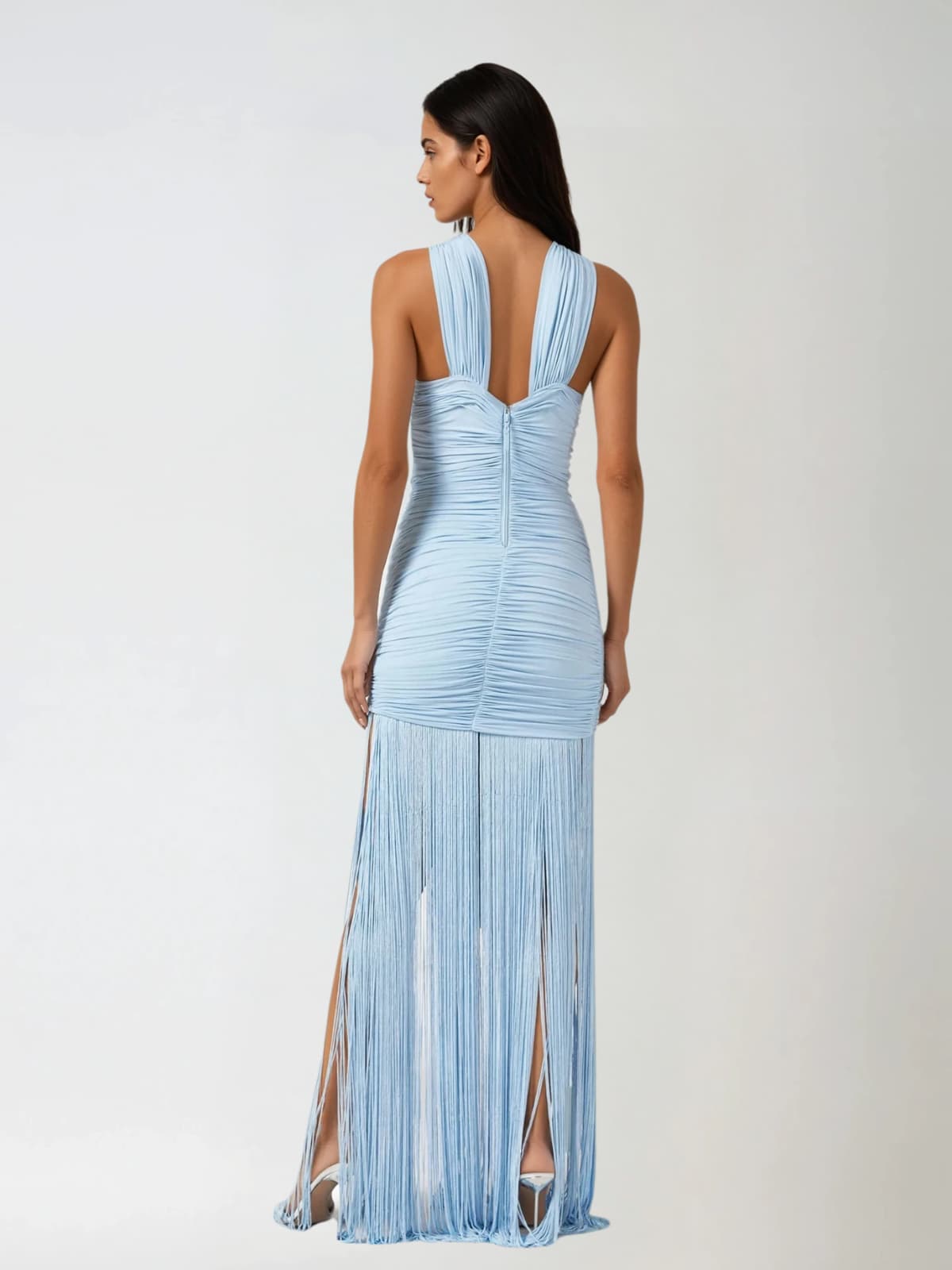 Elevate your style with the Ouray Sleeveless Ruched Fringe Maxi Dress. Designed to flatter every silhouette, its ruched detailing enhances your curves while the sleeveless cut keeps you effortlessly cool. The flowing fringe adds dynamic movement, making this dress perfect for both casual outings and special occasions. Experience comfort and chic elegance in one stunning maxi dress.
